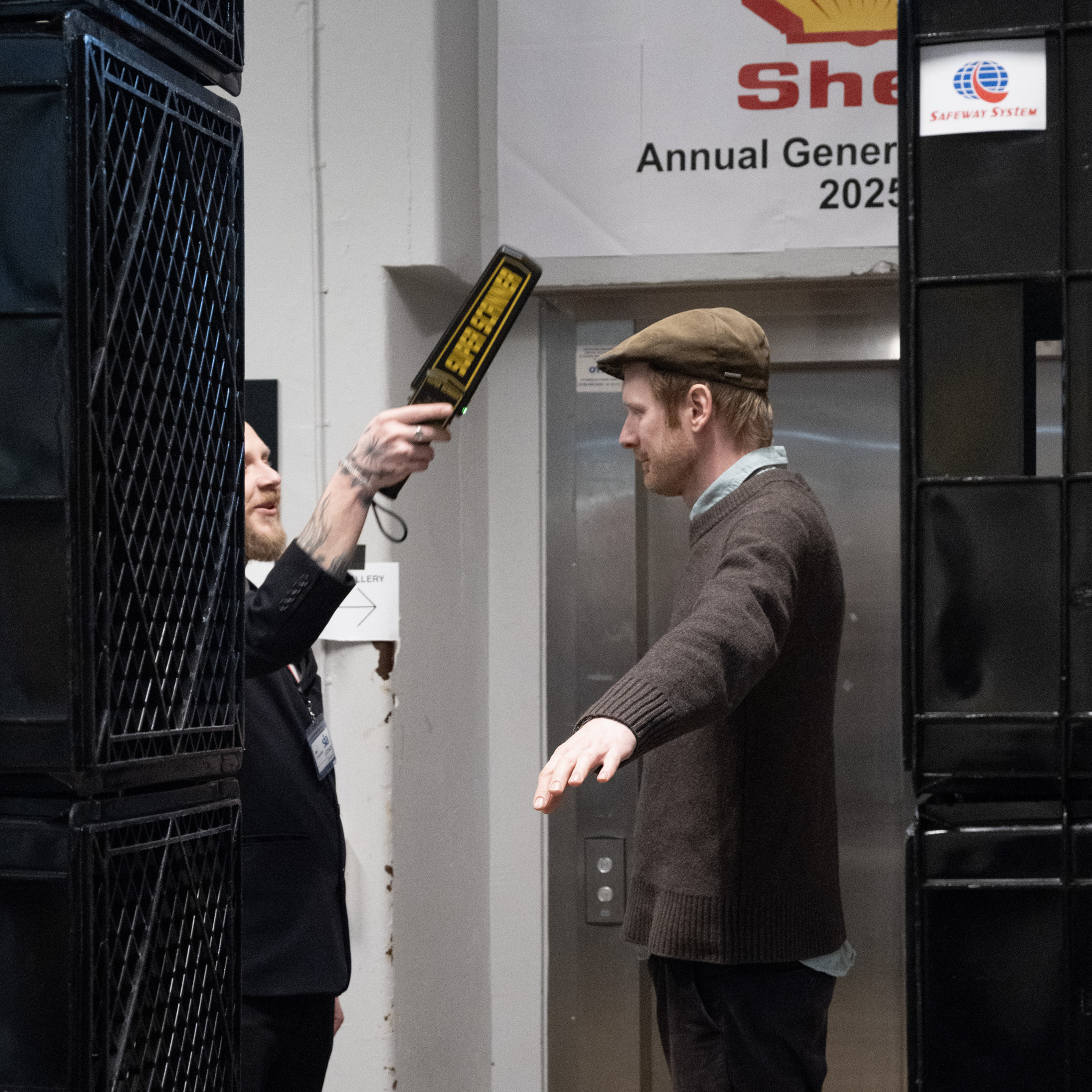 Shell’s previously dull annual meetings turn into intense spectacles, complete with airport-like security procedures. The corporation tries to maintain a respectable façade, even as activists in disguise chant and are carried away by hired guards.